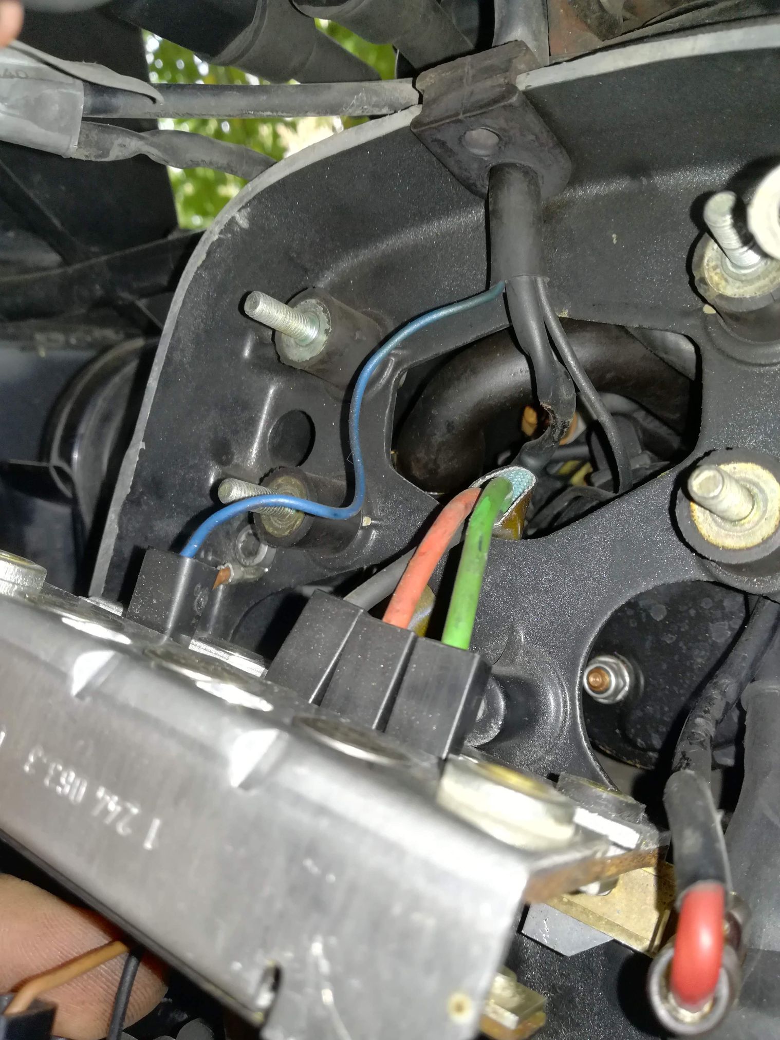 - tocmai am găsit un fir cu izolația roasă. Nu știu ce rol are, dar împreună cu cel albastru intră într-un izolator comun cu cablul firelor care se duc la regulator. Investighez acum. Ca idee, cele două fire (negru și albastru) intră într-un conector chiar în stânga imaginii. Dacă decuplez conectorul, se pare că deconectez demarorul (apăs butonul de pornire și aud doar releul de putere, dar atât).