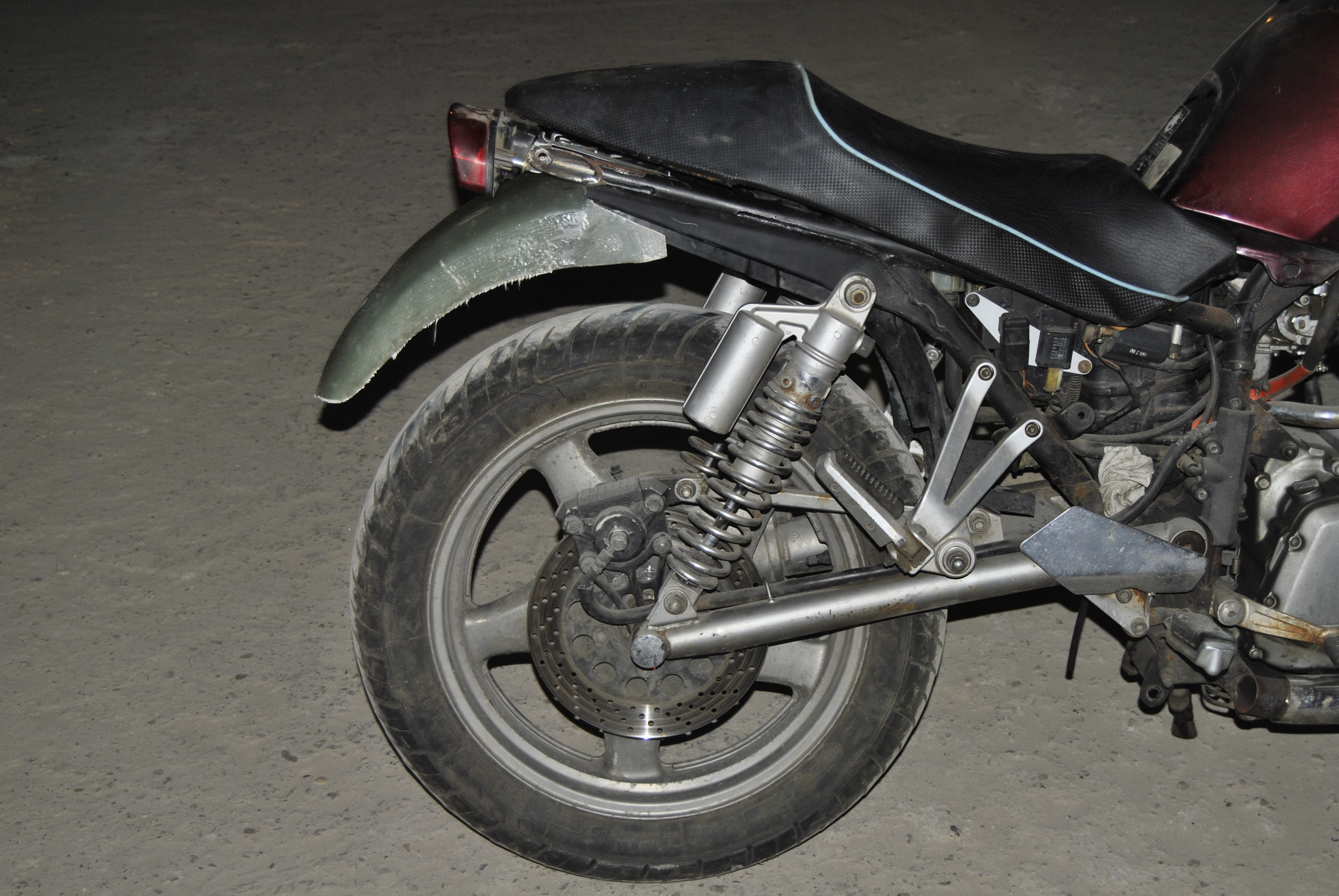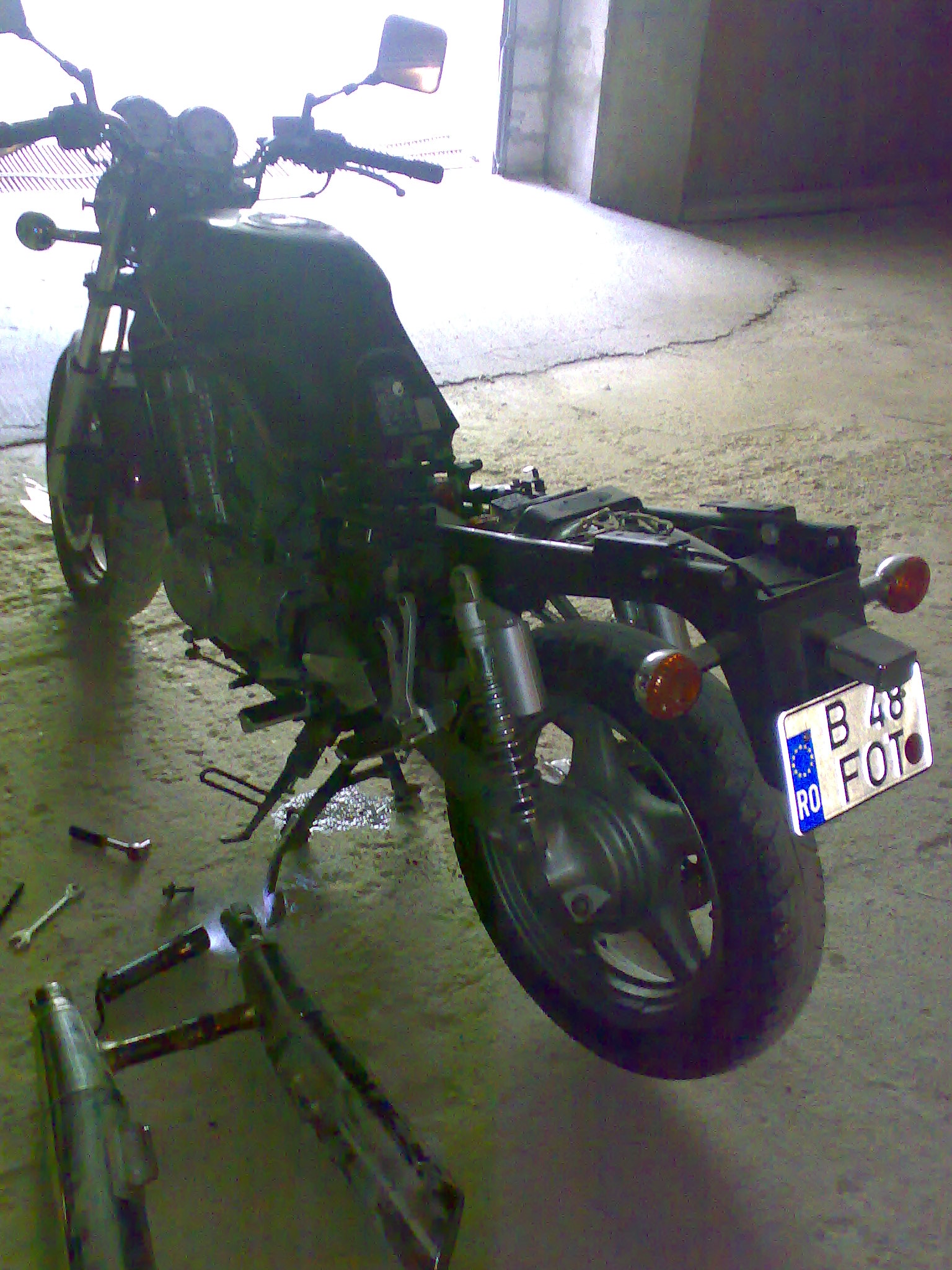 Dupa mult timp pierdut si nervi mancati cu actele VX-ului, am zis ca-l schimb sau il modific. Cum la schimb n-a aparut nimic interesant a intrat la modificat. Momentan croiesc o sa noua avand ca macheta de lucru o sa de Ducati Monster, i-am dat jos carenele de pe coada urmand sa le tai si sa le modific. Tobele au zburat la fier vechi urmand sa fie inlocuite cu unele de Intruder VS1400. Saptamana viitoare va primi si un ghidon de enduroaica, cel actual nu prea ma "coafeaza", apoi vor urma sa intre in productie un bugspoiler si o masca de far (fairing). Maine bag flexu' in cadru sa-l scurtez vreo 10 cm si sa-i refac aripa spate dupa noua configuratie.