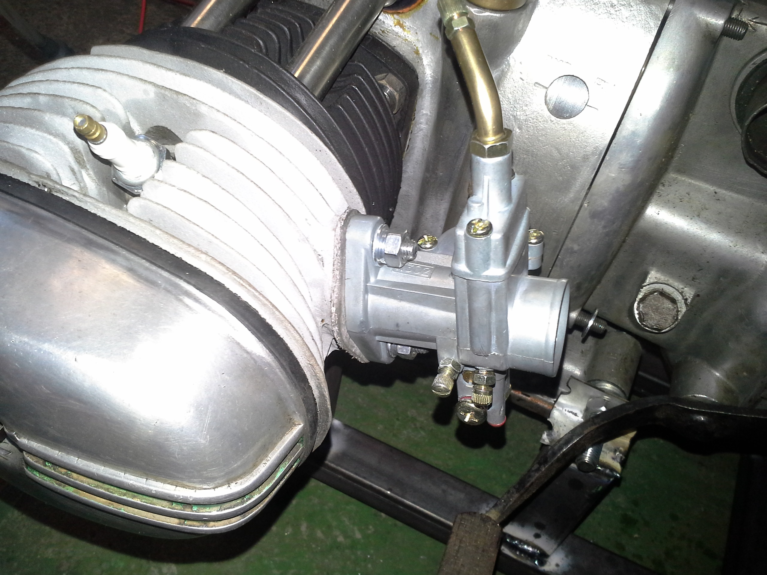 Cu pornirea m-am chinuit ceva astazi, aseara fara sa am carburatoarele montate am incercat o pornire doar cu niste benzina pusa in "gura" cu seringa si a pornit din prima pedala. Am zis ok, maine cu carburatoarele va porni imediat dar nu a fost asa. Bobina de inductie facea figuri, cand verificam dadea scanteie si dadea sa porneasca dupa care murea complet. Dupa ce am schimbat bobina nu am mai avut probleme, motorul il voi regla dupa ce imi aduce Gabi esapamentul, am si eu esapament dar nu intra in chiulasele lui.