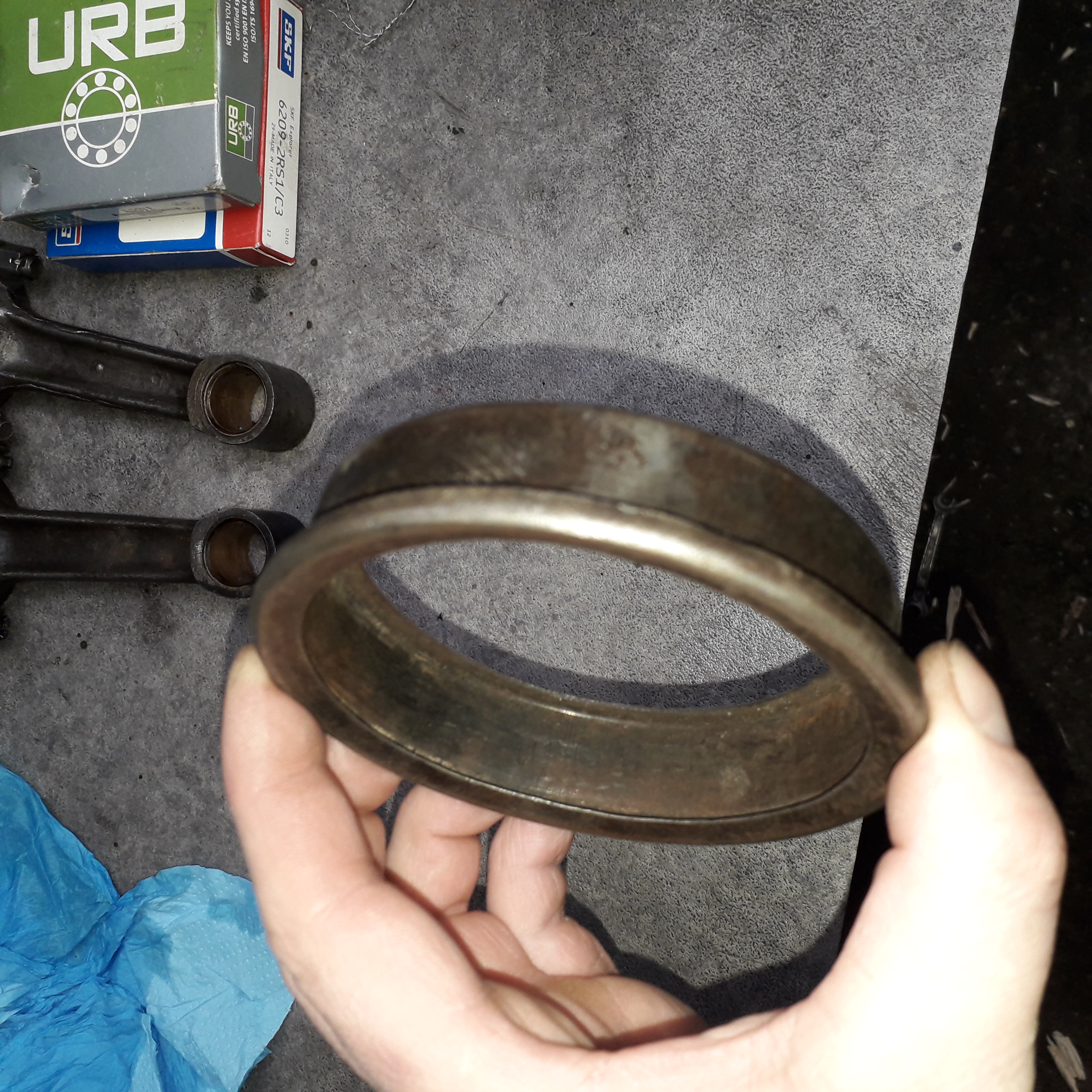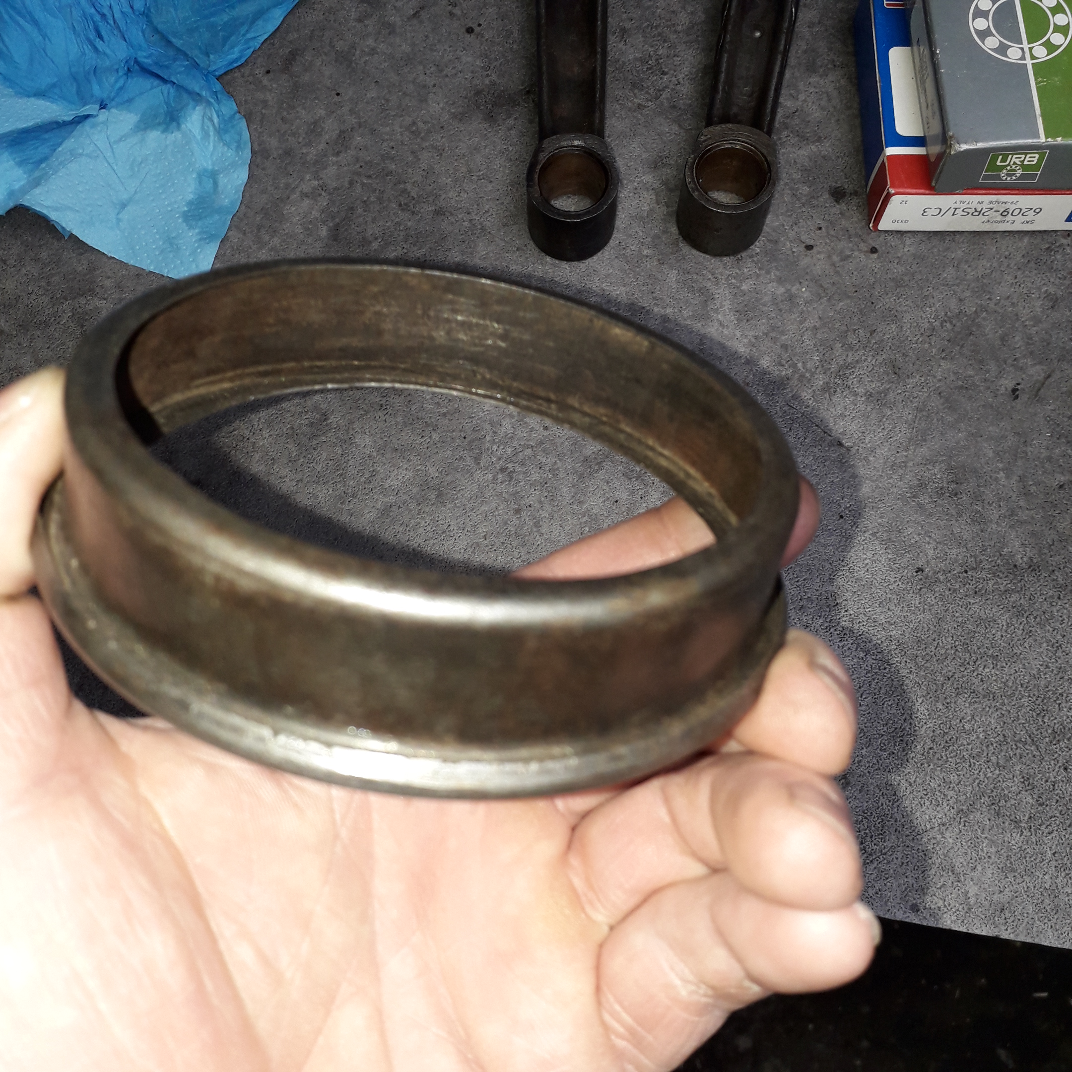 ...daca este realizata corect etansarea la rulmentul de presiune , nu vor fi probleme cu uleiul ce trece prin rulment.Am folosit(in lipsa unui o-ring corespunzator, si mai ales din cauza uzurilor...) pentru etansare , garnitura de pompa de ambreiaj de Raba/Saviem , ajustata sa potriveasca.Are o forma asimetrica si se monteaza cu fusta catre interior...