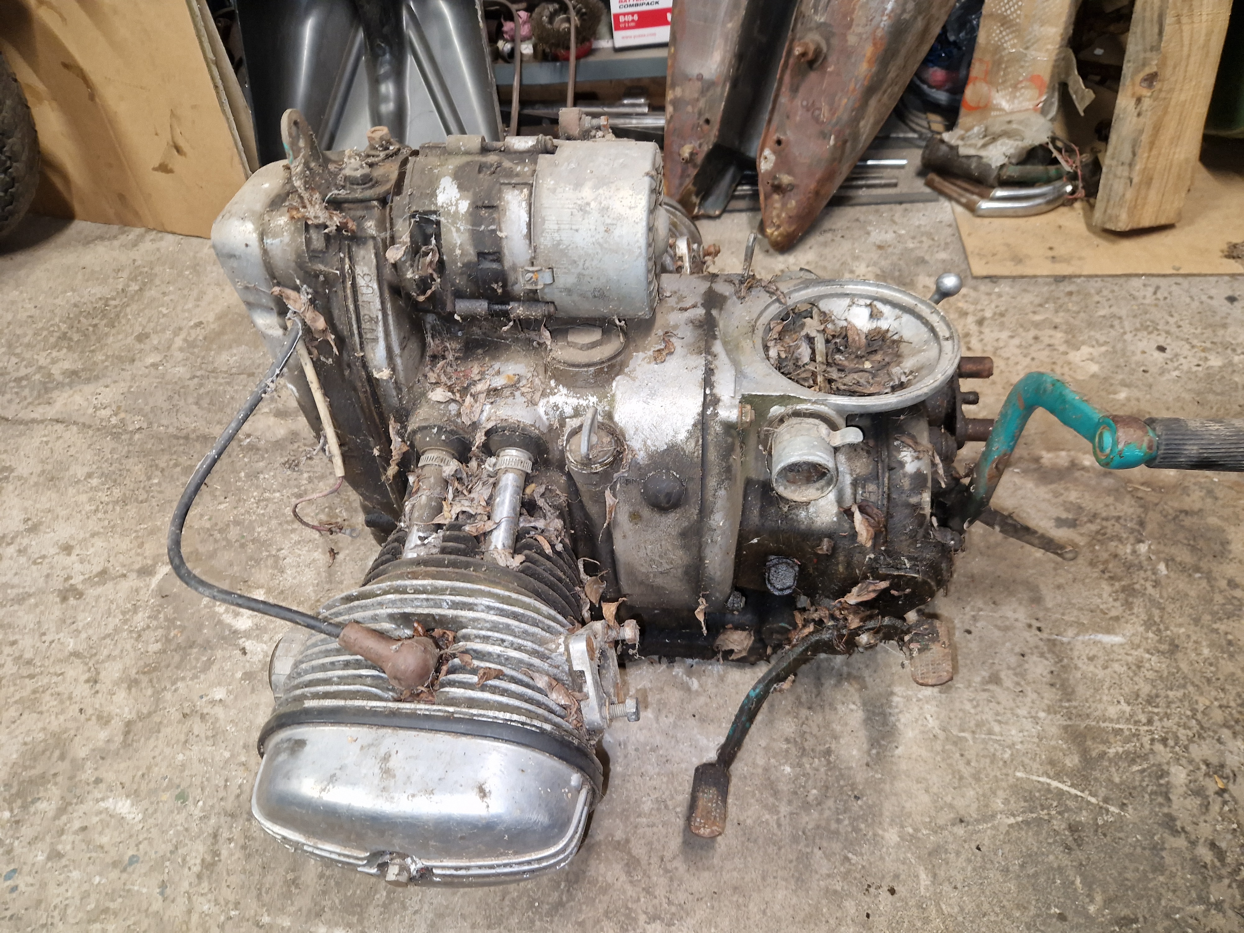 Mi-a aterizat in garaj un motor blocat de Ural 650 M67, adica modelul cu alternator 12V. Ce mi-a placut la el in afara de faptul ca voiam un motor de Ural pe 12V a fost faptul ca era nedesfacut si complet iar daca ai noroc poti avea multe piese bune.