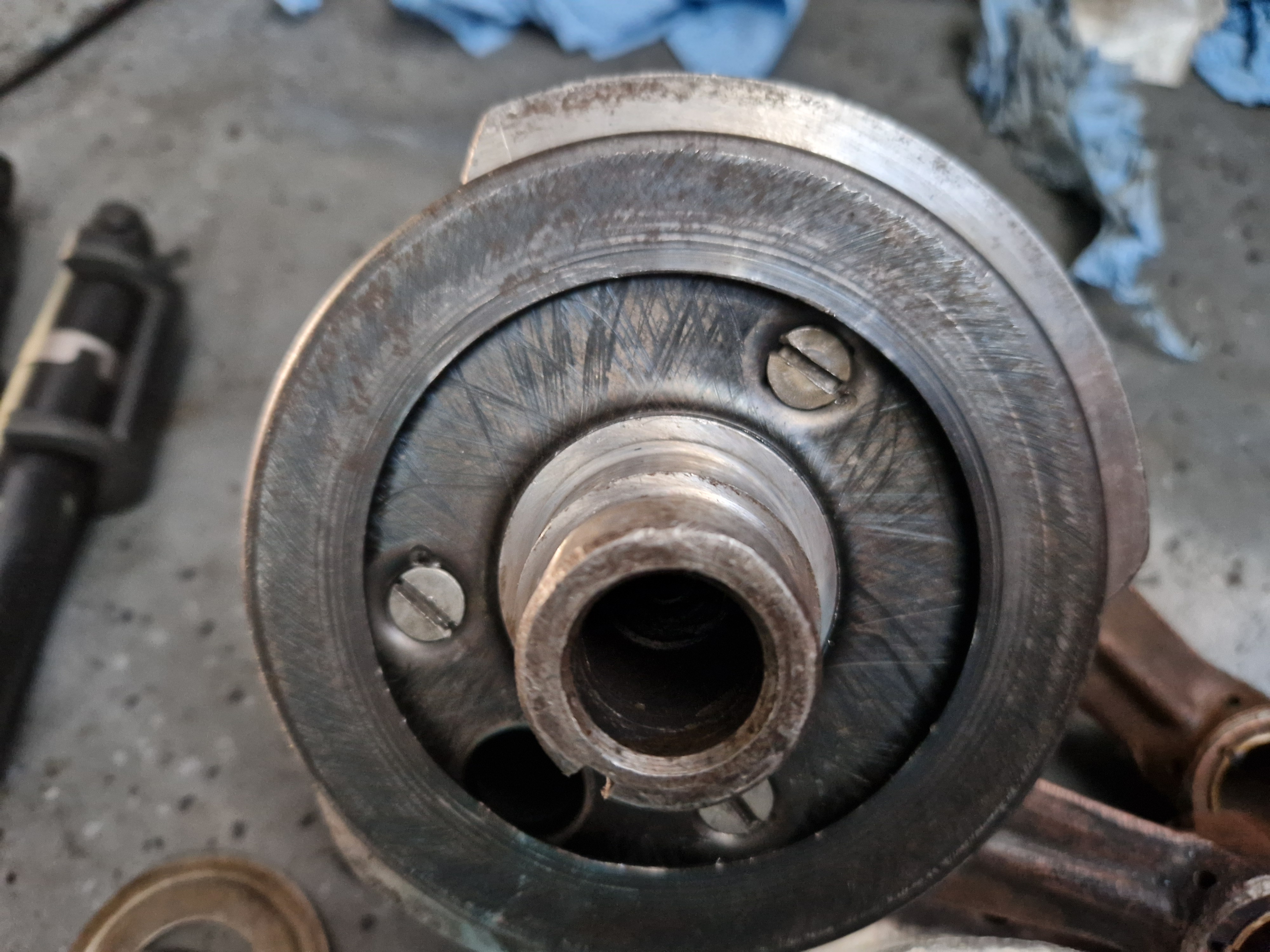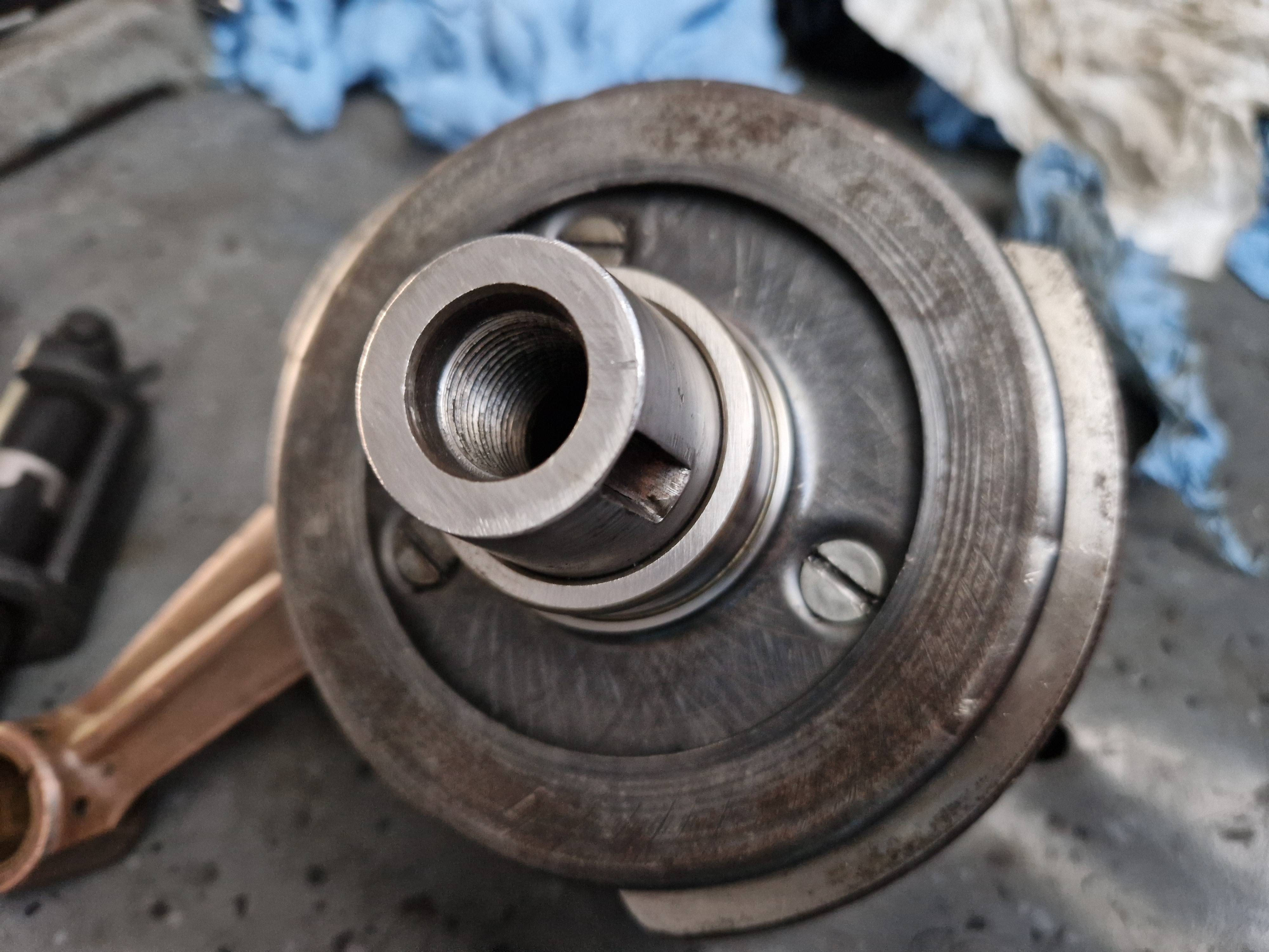 Dupa cum se vede progresez foarte lent, lipsa de timp este un factor nemilos. Am imperecheat volantul cu ambielajul, asamblarea lor se face pe con iar la boxerele rusesti de regula nu sunt bine definite si au joc. Din cauza acestui joc se intampla relativ des sa se slabeasca volantul chiar daca e strans bine iar acest lucru duce la dustrugerea lacasului de pana in volant si in ambielaj.