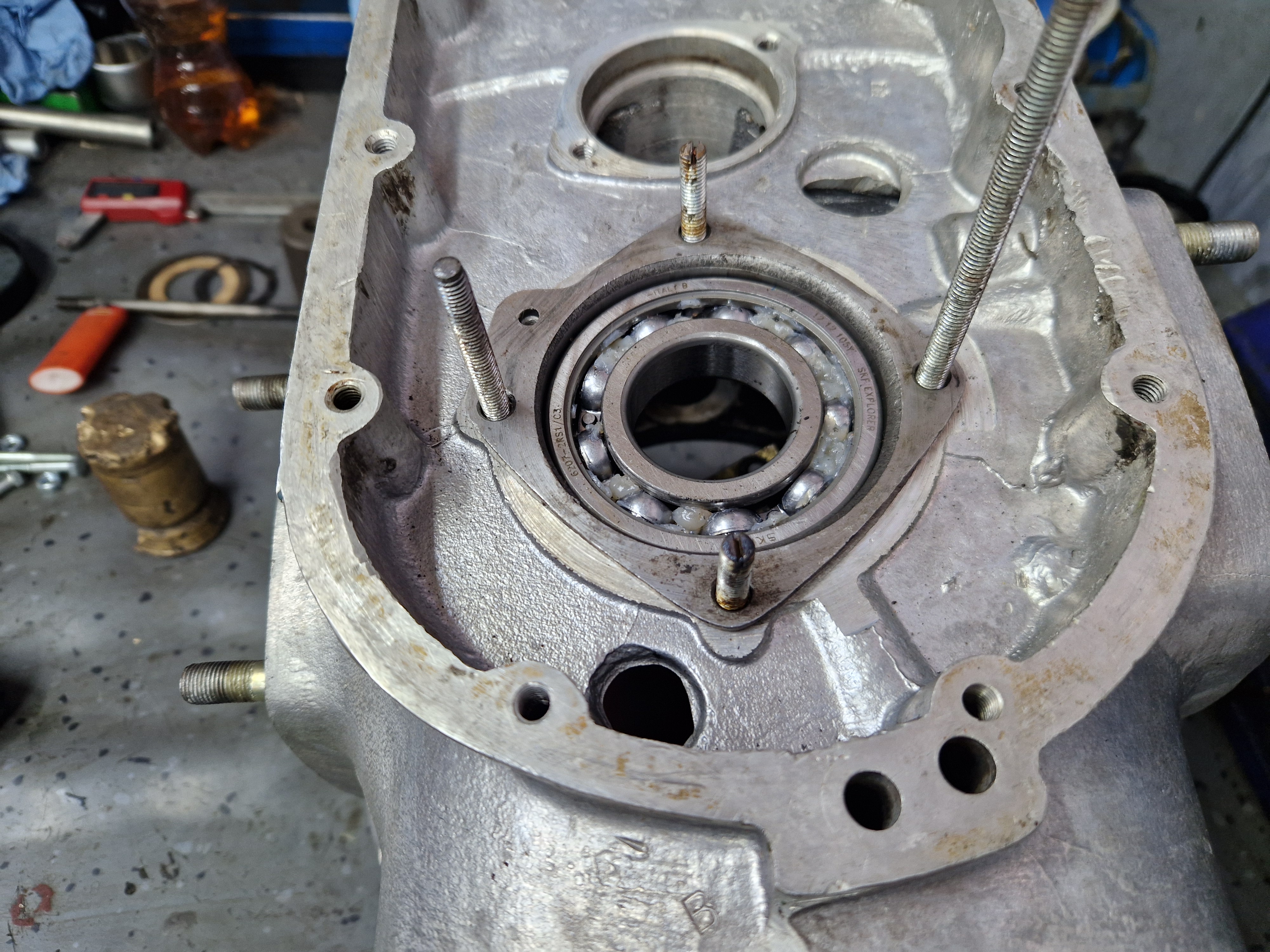 Rulmentii sunt SKF 6207 C3 cu bile si URB NJ207 cu role. In mod normal sunt necesari doi rulmenti 6207 C3 dar rulmentul cu role NJ207 cu role va fi montat in spatele ambielajului unde vine volanta. Avantajul este ca rulmentul cu role este mai rezistent si totodata ajuta mult la montarea palierului spate deoarece camasa interioara se monteaza pe arbore si intra prin alunecare pe bile. Astfel te "chinui" sa presezi palierul spate doar in carter, nu si pe rulment. Sistemul cu rulment cu role in spate il are si Dnepr650 dar de fapt treaba este inspirata de la motoarele de BMW care s-au facut in anii '50.