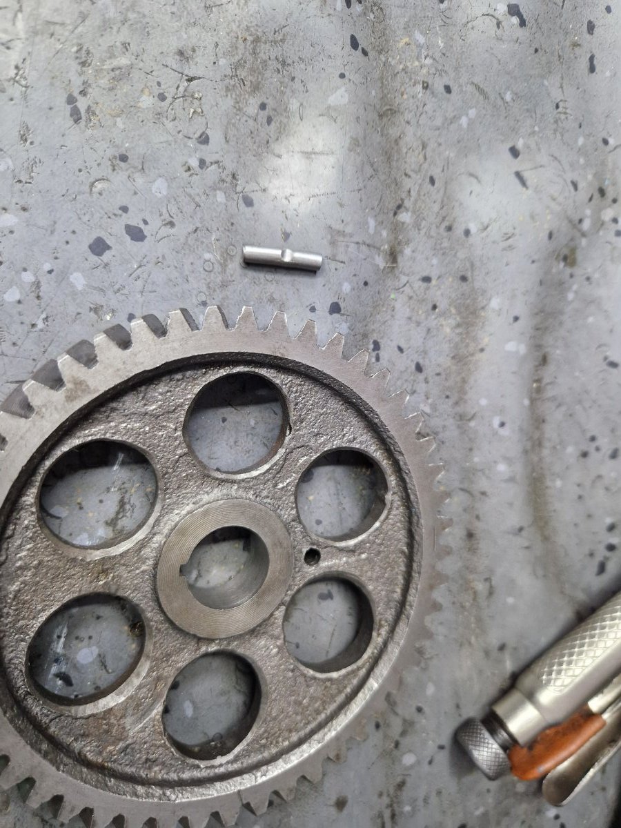 Tot inainte de asamblare e bine sa montezi si boltul care invarte supapa rotativa (epurator) din capacul de distributie. Pare o treaba simpla dar nu e chiar asa, trebuie folosit un bolt de otel si securizat cu maxima raspundere. Eu am gasit un bolt de otel de 5mm pe care l-am presat la cald in pinion si ca nu iasa in timp din lacas am marit prin presare boltul diametrului in partea din fata inaintea pinionului si l-am inflorit prin bataie pe spatele pinionului. Trebuie masurat cu atentie pentru a avea suficient material pentru inflorirea boltului pe spate: