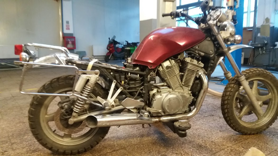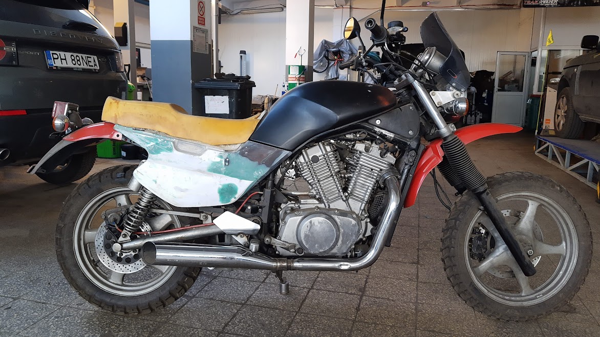 Sa facem un update. Din varii motive ce tin in continuare de scranteala personala Dino a mai trecut prin niste serii de modificari, ca intr-un final sa ajunga un fel de scrambler, da' mai degraba un big enduro mai old school. Asta este versiunea finala, momentan fararack de bagaje. Poate ar fi fost gata proiectul asta daca nu mi-as fi complicat viata cu o casa la curte construitade la 0, cateva motoare achizitionate pe traseu, si un accident stupid care ma tine de aproape 4 luni in pat.